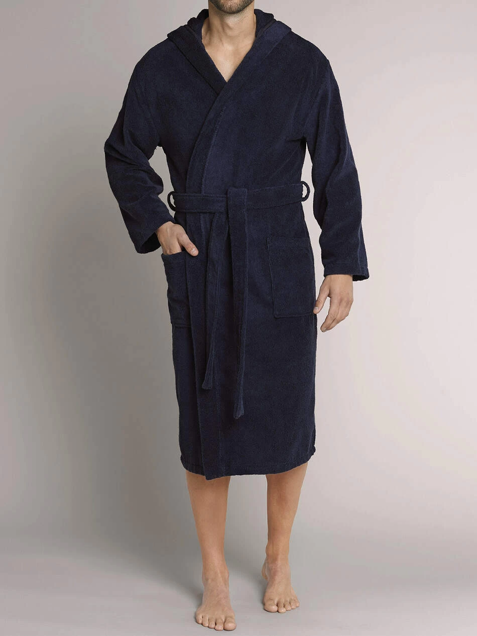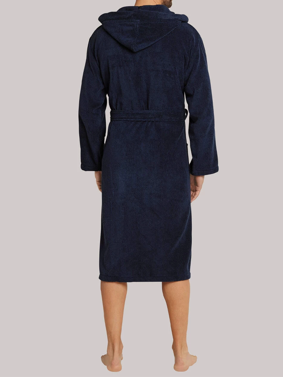 Aus der Schiesser Bademäntel Serie – eine bequemer Bademantel Morgenmantel in dunkelblau aus 100% Baumwolle und in feinem Frottee Gewebe, legerer Schnitt, mit Kapuze und mit aufgesetzten Taschen. Erstklassige Qualität. Ideal als Homewear und für die Freizeit. Der Klassiker ist in hoher Verarbeitungsqualität gefertigt.