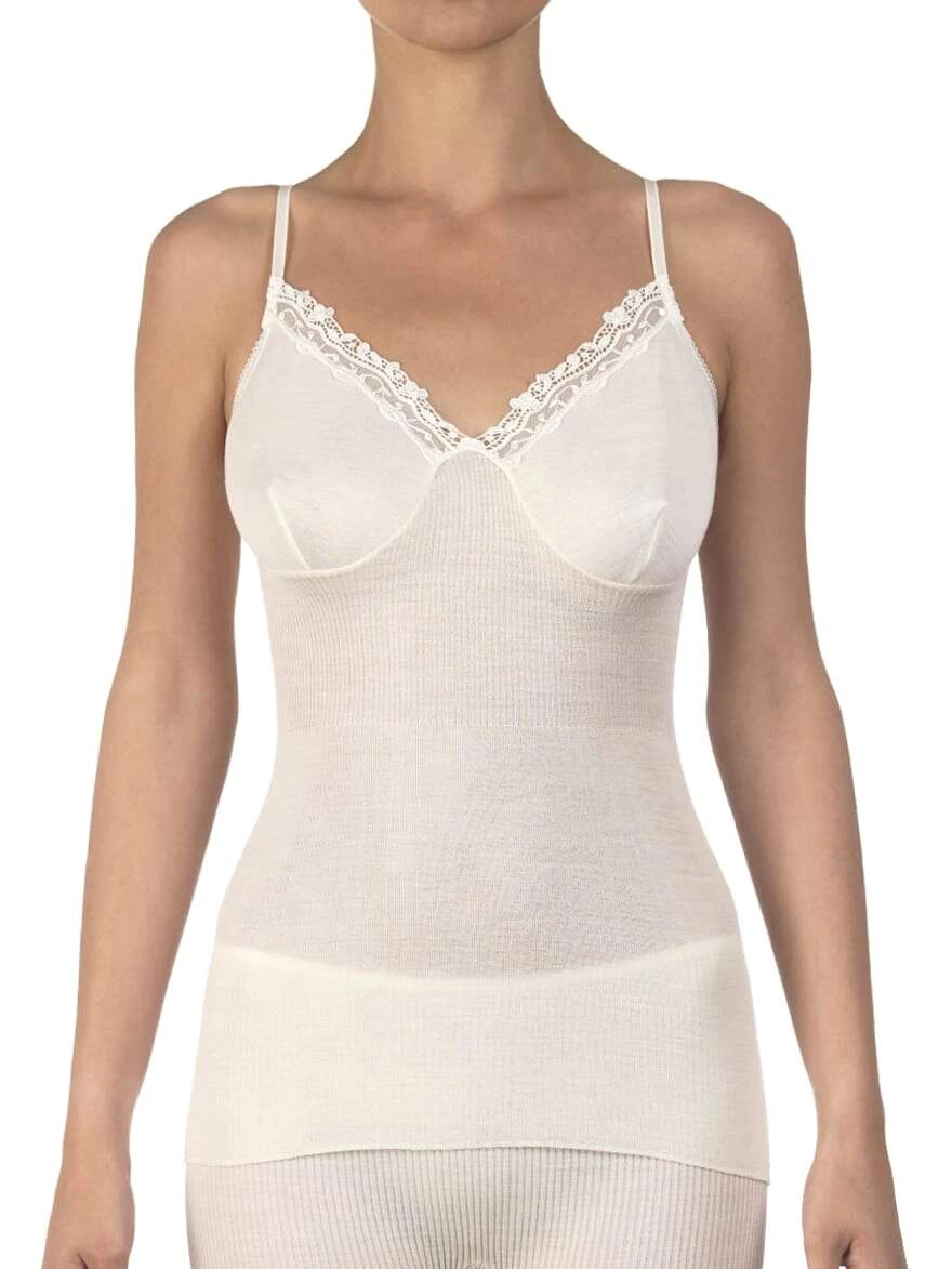 Ein BH Hemd in creme in perfekter Passform, aus der Serie Wool & Silk der Luxusmarke Oscalito – Unterwäsche für Damen. Feine, zarte Optik, und schlichte Eleganz vereinen sich zu purem Luxus auf der Haut. Feinste Wolle und Seide verarbeitet zu behaglichem Gewebe verleiht dem Kleidungsstück einen weichen Griff. Ein Top mit V-Ausschnitt mit Tülleinsatz und feiner Spitze welches höchsten Ansprüchen an Bequemlichkeit gerecht wird.
