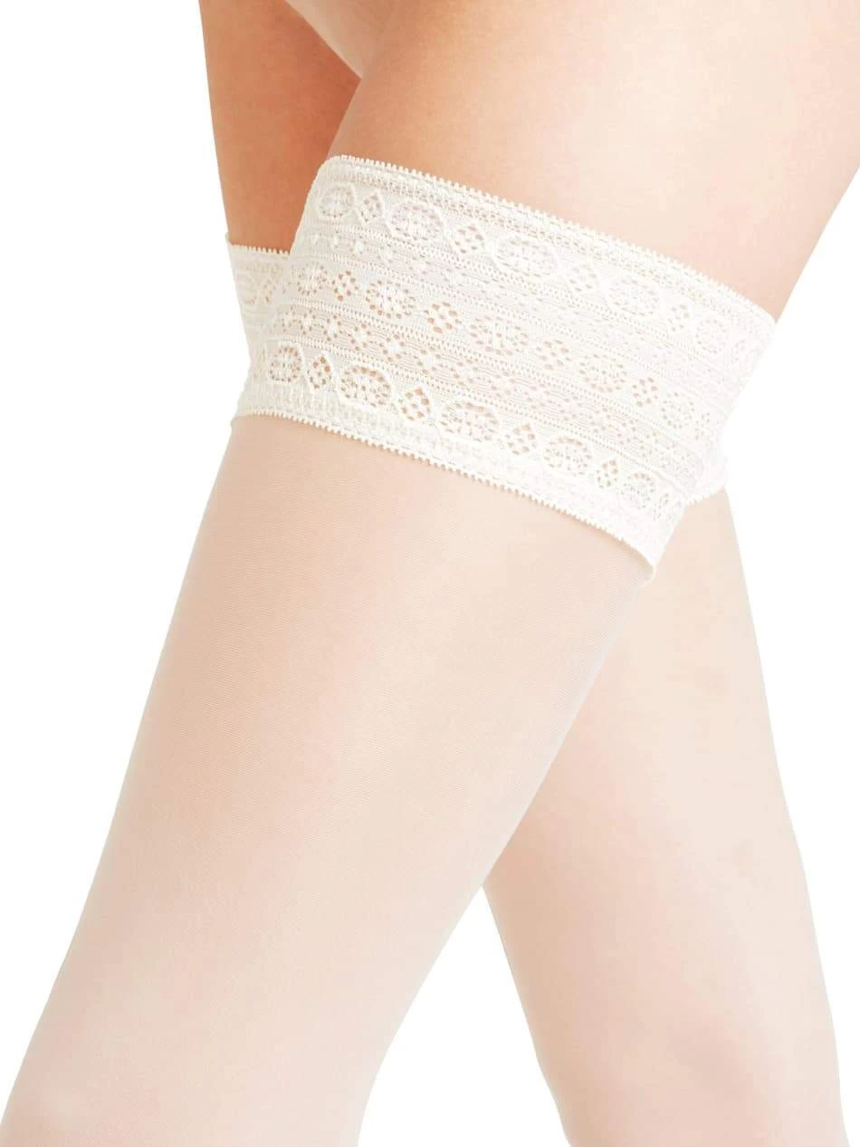 Ein edler und fein transparenter halterloser Strumpf aus der FALKE Kollektion Seidenglatt 15 ist in den verschiedensten Farben verfügbar. Das verbesserte, ebenmäßige Maschenbild sorgt für einen seidigen Glanz und erstklassiges Hautgefühl. Dieser Overknee Feinstrumpf zeichnet sich durch perfekten Tragekomfort sowie leicht verstärkte Fußspitzen mit Maschenstop und Softnaht aus. Abgerundet wird das Gesamtbild durch eine rutschsichere Silikonbeschichtung im Bund, welcher durch florale Spitzenverzierung super in Szene gesetzt wird. 15 den