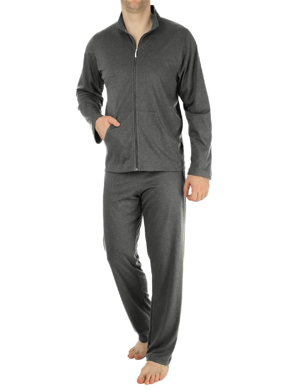 Der legere Hausanzug Micha – hier in einer Ausführung aus weichem Interlock aus 100% Baumwolle. Der komfortable Zweiteiler in edlem Anthrazit überzeugt mit Liebe zum Detail. Ob die hochwertig verarbeiteten Zipper, die runden Eingrifftaschen oder der passend abgesetzte Webstoff an den Tascheninnenseiten – hier spricht jede Naht für eine exquisite Verarbeitung. Die gerade geschnittene Hose wartet mit einem elastischen Gummibund mit Bindeband zur Weitenregulierung auf. Die Hosentaschen bilden ein praktisches Extra. Machen Sie keine Abstriche bei Ihrem Wohlbefinden und überzeugen Sie sich selbst von diesem NOVILA Klassiker.