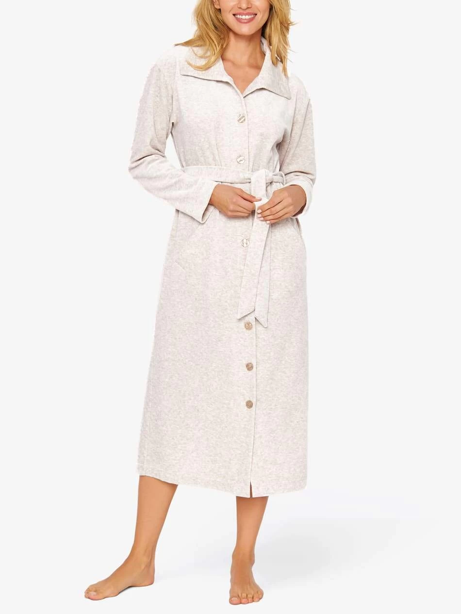 Dieser komfortable Hausmantel vereint einen hohen Tragekomfort mit eleganter Optik. Der weiche Nicki-Stoff liegt angenehm soft auf der Haut und sorgt für wohlige Geborgenheit. Ein stilvoller Look entsteht zudem durch die elegante Knopfleiste und den zusätzlichen schmalen Bindegürtel. Ein spitzer Kragen und schräge Eingrifftaschen runden das Outfit wunderbar ab. Die Robe ist 120cm lang.