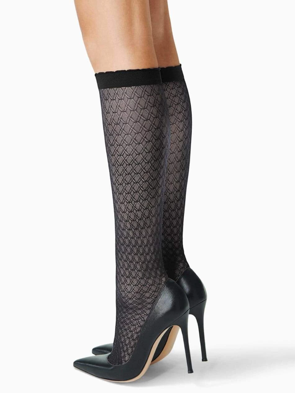 Von Fogal ein Damen Kniestrumpf aus der Serie 3063 Signature. Es handelt sich bei diesem Kniestrumpf um einen Klassiker mit filigranen Fogal Rauten, inspiriert durch das geschwungene F des Fogal-Logos. Er besitzt eine verstärkte Fussspitze, ein zartes Muschelbündchen und glänzt durch perfekte Passform.