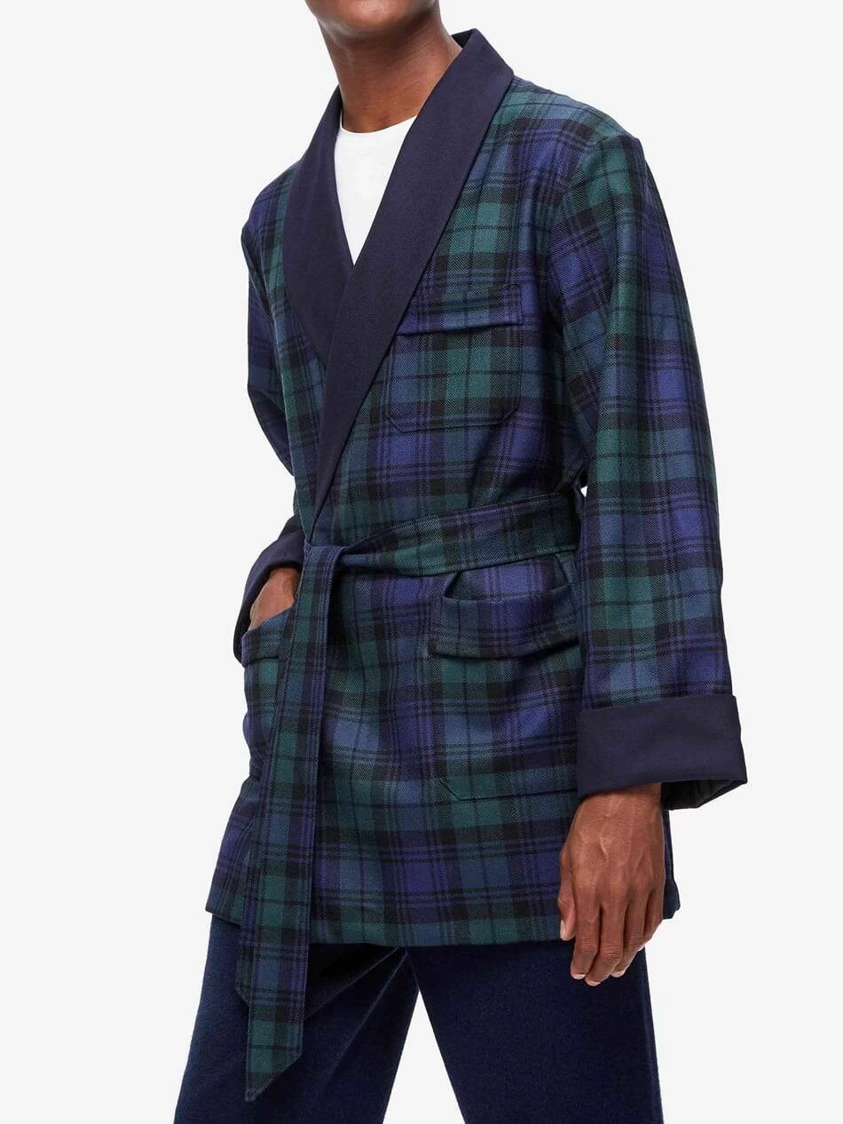Eine moderne und zugleich minimalistisch geschnittene Version der klassischen Smokingjacke von Derek Rose. Das einfach gehaltene Design mit einem geschmackvollem Schalkragen und traditionellen Umschlagmanschetten ergänzt sich stilvoll zu dem klassischen Tartan-Design. Die Jacke ist aus feiner Kammwolle gefertigt und verspricht Wärme und Komfort, ohne schwer und sperrig zu sein. Ein Must-have für die kältere Jahreszeit oder als stylische Alternative zum Morgenmantel.