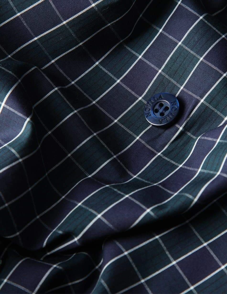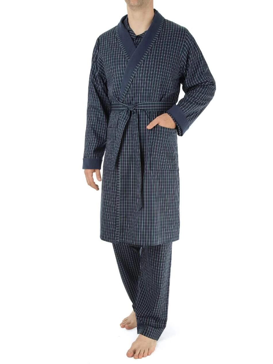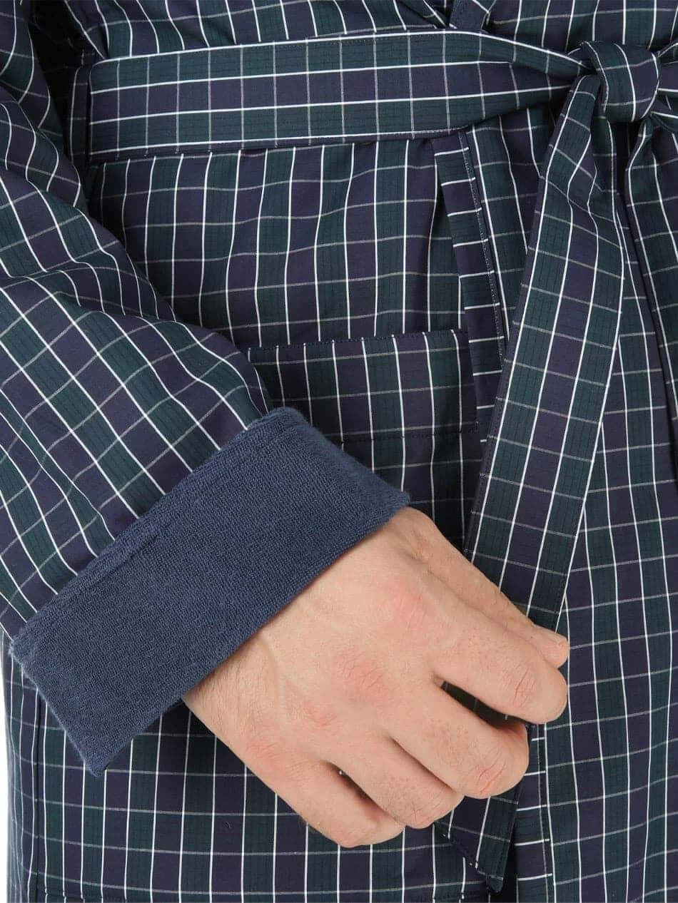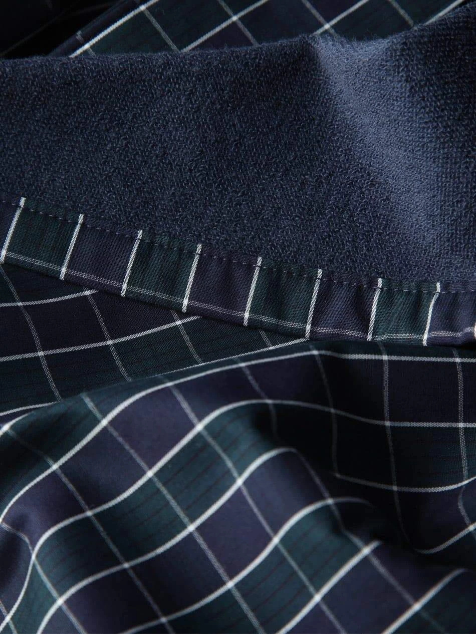 Ein exquisiter Morgenmantel der Marke NOVILA aus hochwertiger Baumwollware. Der Außenstoff besteht aus feinstem, karierten Popeline. Untersetzt ist dieser mit einem Futterstoff aus hautschmeichelndem Frottee. Für eine vornehme Optik sorgen der breite Schalkragen und die dekorativen Ärmelaufschläge. Zwei große, aufgesetzte Taschen und ein Bindegürtel sorgen für praktischen Komfort. Die Robe ist circa 113cm lang und lässt sich wunderbar zu den Pyjamas der Marke ergänzen.