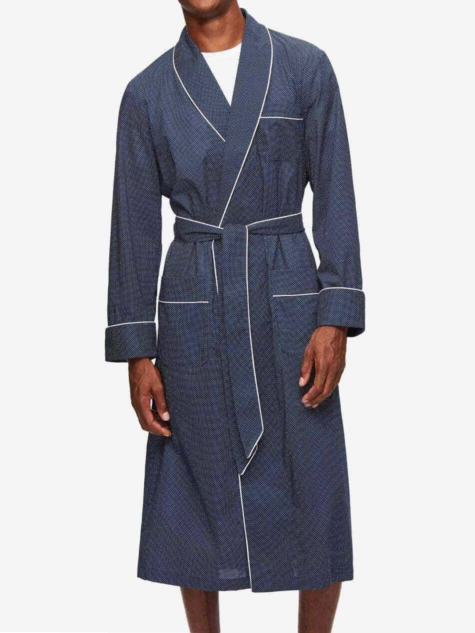 Der elegante Morgenmantel Plaza 21 ist ein stilvolles und zugleich zeitloses Wäschestück für den anspruchsvollen Herren. Gefertigt aus einem extra leichten und atmungsaktiven Batist aus reiner Baumwolle, ist dieser Mantel der ideale Begleiter für die wärmeren Monate oder über einen warmen Pyjama, wenn das Wetter kühler wird. Das klassische Schalkragendesign mit einer Brusttasche und zwei Vordertaschen ergänzt sich stilvoll zu dem minimalistischen Punktedruck. Luxuriöse Paspelierungen runden den Look ab.