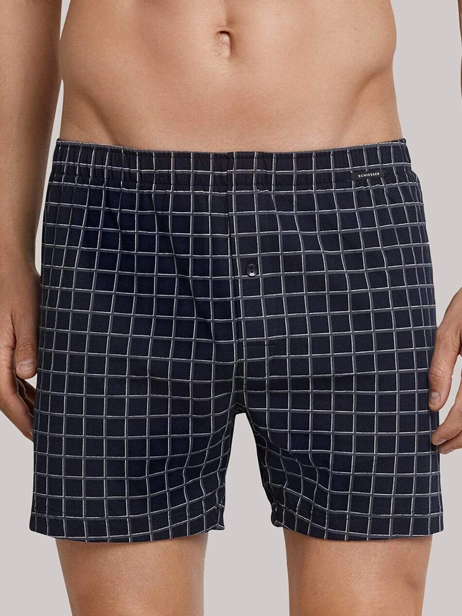 Schiesser Herrenwäsche aus der Day and Night Serie – hier ein Herren Boxershort mit Eingriff in dunkelblau mit modischem Karomuster. Durch die Verwendung reiner Baumwolle verleiht Ihnen das weiche Single Jersey Gewebe ein tolles Tragegefühl. Ein stilvoll geköpfter Eingriff rundet das Gesamtbild ab. Einfach das perfekte Basicwäschestück für jeden Tag.